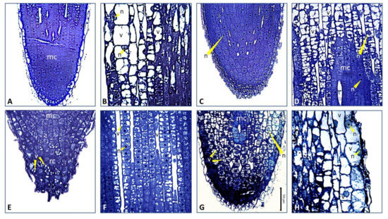 These observations were further confirmed by transmission light microscopy analyses (Figure 6, Figure 7). The root tips of wild-type plants grown under high P conditions showed the expected anatomical organization (Figure 6). The meristematic apex at the root tip consisted of small cells with isodiametric shape and a large nucleus in the center. The meristematic zone was longitudinally shorter compared to that observed at the root tip of P-starved wild-type plants. In the elongation zone, cells showed juvenile characteristics with diffuse vacuolization suggesting ongoing differentiation processes. In the differentiation zone, cells larger in size were evident, each one enclosing a prominent central vacuole, which is a typical feature of adult cells (Figure 6, Figure 7B). Phosphorus starvation caused anatomical changes in the root tips of wild-type plants, such as the extension of the meristematic zone along the longitudinal axis. This zone was, however, well organized, characterized by typical small cells, each one with a large nucleus in the centre (Figure 6, Figure 7C,D). In the elongation zone, cells maintained the nucleus in central position with several vacuoles scattered in the cytoplasm, which is typical of cells that are differentiating, but are not yet adult. The formation of large adult cells containing one or few vacuoles was clearly delayed compared to wild-type plants under high P conditions.