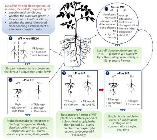 Conclusive conceptual summary. (1) Strigolactone (SL) analogue (rac-GR24) application to wild-type (WT) tomato plants under low P promoted root morphological modification to favor P acquisition; (2) the continuous growth under P stress (–P) limited root capacity to respond to P stress, especially in the strigolactone-depleted (SL–) plants; (3) under suboptimal P supply (LP), a detectable role of SL in improving plants responses to P stress was highlighted: SL– plants showed an attenuated capacity to respond to LP, for some specific features; (4) imposition of severe stress (no P, –P in the scheme) after acclimation on LP revealed the inability of SL– plants to respond to P stress in the long term, possibly because of root development impairment caused by the anatomical modifications observed at the microscopic scale (5). Abbreviations: PR: primary root; TR: total root; LR: lateral root; RV: root volume; RD: root diameter; RH: root hair.