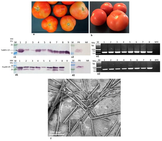 Symptomatic traded tomatoes were co-infected by tomato brown rugose fruit virus (ToBRFV) and pepino mosaic virus (PepMV). (a) Symptomatic tomatoes showing bleaching and marbled yellow spot phenotypes; (b) Asymptomatic tomatoes; (c,d) Western blot analyses of symptomatic tomatoes; (c1) ToBRFV coat protein (CP) detection in symptomatic fruits; (c2) CP detection in ToBRFV-infected tomato leaves; (d1) PepMV CP detection in symptomatic fruits. The extra low molecular weight bands detected by the antibodies are apparently degradation products, as compared with data presented in (d2); (d2) CP detection in PepMV-infected tomato leaves; (e1) RT-PCR amplified 615 bp segments of ToBRFV CP in the western blot positive co-infected tomatoes; (e2) RT-PCR amplified 650 bp segments of PepMV CP in the western blot positive co-infected tomatoes; (f) Transmission electron microscopy visualization of symptomatic fruit virion purification showing particle morphology resembling tobamovirus and potexvirus viral genera. M, molecular weight; PR, positive reference; NR, negative reference; NTC, non-template control; Po, potexvirus; To, tobamovirus; arrows mark specific viral particles.