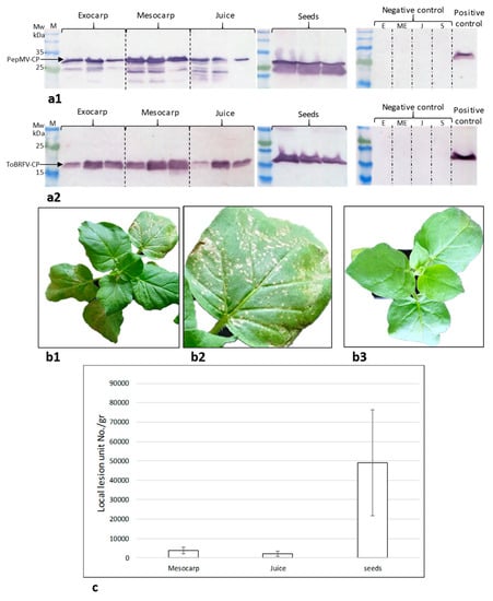 Infectivity potential of components of tomato brown rugose fruit virus (ToBRFV) and pepino mosaic virus (PepMV) co-infected tomatoes. (a) Western blot analyses of co-infected tomato fruit components; (a1) PepMV coat protein (CP) detection in fruit components of three representative symptomatic fruits; (a2) ToBRFV CP detection in fruit components of three representative symptomatic fruits; (b1) A biological assay allowing visualization of ToBRFV induced local lesions on a representative Nicotiana glutinosa plant; (b2) A close-up image of ToBRFV induced local lesions on a N. glutinosa leaf; (b3) An untreated N. glutinosa plant; (c) ToBRFV-induced local lesion number on N. glutinosa leaves (n = 27 for each test), in one gram of fruit mesocarp, juice or seeds; M, molecular weight; E, exocarp; ME, mesocarp; J, juice; S, seeds.