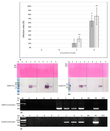 Pepino mosaic virus (PepMV) and tomato brown rugose fruit virus (ToBRFV) infectivity potential of the symptomatic tomatoes. (a) A graph of ToBRFV and PepMV infection ratio means ± standard deviations, using A–D inoculation modes, as calculated from exp. 1–4 (presented in Table 2); (b) Western blot analyses of tomato plants inoculated by two different fruits using A–D inoculation modes. (c) RT-PCR analyses of tomato plants inoculated by two different fruits using A–D inoculation modes. (c1) RT-PCR amplified 615bp segments of ToBRFV CP. (c2) RT-PCR amplified 650 bp segments of PepMV CP. A, rubbing leaves with intact symptomatic fruits; B, rubbing leaves with hands after touching intact symptomatic fruits; C, applying symptomatic fruit juice onto tomato leaves; D, rubbing leaves with symptomatic fruit juice; M, molecular weight; H, healthy leaves; ToBRFV is marked with dots; PepMV is marked with horizontal lines; * p < 0.05 (p = 0.0266), t-test comparing PepMV inoculation modes C and D; ** p < 0.05 (p = 0.008), t-test comparing ToBRFV inoculation modes C and D. Bars are standard deviation of the mean. H, healthy tomato plants; NR, negative reference; PR, positive reference; NTC, non-template control.