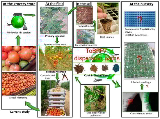 In our studies, we have observed that symptomatic tomato fruits in systemically ToBRFV-infected plants amounted only to ≤30% of the fruit yield, depending on the plant variety and climate conditions, although all the fruits were ToBRFV-positive (Dombrovsky et al., unpublished data). This implies that a low percentage of symptomatic fruits could still be an indication of a vast disease spread potential. Our study apparently provided a link between traded-infected fruits and a possible viral epidemic in the farms. In a scheme, summarizing ToBRFV dispersion paths (Figure 5), it is suggested that traded fruits could constitute an additional primary source of infection, which was until now attributed mostly to seed trade and to crops or weeds grown in soil contaminated from previous growing cycles. As mentioned above, although ToBRFV is a seed-borne virus and easily detected in contaminated seeds (by in situ immunofluorescence and western blots, Figure 2 and Figure 3), disease spread from seed-to-seedling is still under study. Importantly, there is a major contribution of mechanical transmission to a secondary spread of the virus either via plant manipulations such as pruning, trellising or spread by beneficial pollinators []. Practicing hygienic behavior (e.g., while fruit consuming in tomato growing areas), compatible to the outcome of our data, could reduce the risk of viral disease spread. An additional interesting outcome derived from this current study is the application of final-fruit packaging procedures in proximity to the growing areas, thereby preventing fruit manipulations and minimizing the risks of viral disease spread by consumers worldwide.