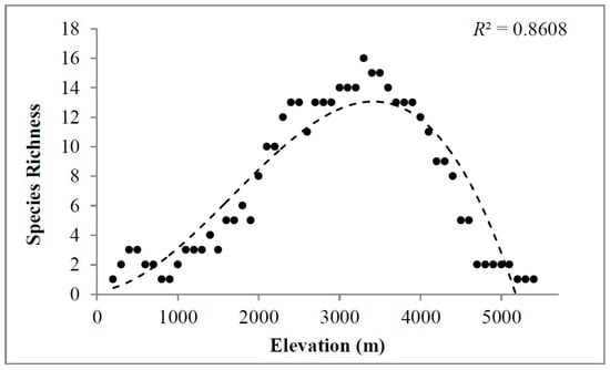 There was an abrupt increase in elevation in the country from south to north (Figure 1) and a total of 26 gymnosperm species were reported to distribute along Nepal Himalaya between 201–5400 m elevations. The highest recorded number of species (S = 16) was at 3300 m, and the pattern of species richness of gymnosperms was decidedly unimodal, forming a hump-shaped distribution pattern (R2 = 0.86) (Figure 2). As was apparent from Figure S1 of Supplementary Materials, the environmental predictors also vary along the elevation gradients. In general, all the environmental variables showed a monotonic decrease along the elevation gradients.
