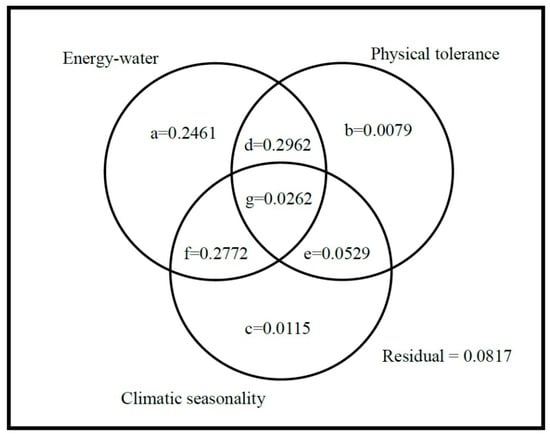 Finally, we used variation partitioning to determine the individual and combined fraction of all predictor sets. Variation partitioning allows us to access the pure effects of the predictor sets and their shared contribution in better explaining the species richness pattern of gymnosperms []. This technique is commonly used in community ecology when two or more complementary sets of hypotheses possibly determined the variations in species richness []. In this study, we determined the effect of three sets of response variables on species richness using R2-adjusted (R2adj) as the goodness-of-fit. Variation partition led to eight fractions: (a) fraction explained by energy-water, (b) fraction explained by physical tolerance, (c) fraction explained by climatic-seasonality, (d) fraction explained by joint effect of energy-water and physical tolerance, (e) fraction explained by joint effect of physical tolerance and climatic seasonality, (f) fraction explained by joint effect of energy-water and climatic seasonality, and finally, (g) joint fraction between all three predictor sets. The residual is the unexplained fraction of variation partitioning (Figure 3 and Table S1 Supplement Materials). Variation partitioning technique was previously used in explaining the effect of environmental factor on species richness patterns [,]. The relationship between species richness and its environmental correlates using GLM and variation partitioning allows us to compare the relative importance of energy-water, physical tolerance, and climatic seasonality in explaining the species richness patterns of gymnosperms in Nepal along elevation gradients.