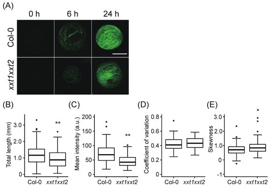 Comparison of cell wall regeneration between WT (Col-0) and xxt1 xxt2 protoplasts. (A) Representative images of network structure in the cell wall of Col-0 and xxt1 xxt2 protoplasts incubated for 0, 6, and 24 h and stained with Calcofluor. (B–E) Total length (B), mean intensity (C), coefficient of variation (CV) of fluorescence intensity distribution (D), and skewness of fluorescence intensity distribution (E) of the network measured at 24 h. Center lines of box-plot show the medians, boxes indicate interquartile range (IQR), whiskers indicate 1.5 IQR, and outliers are shown by dots. The experiment was repeated three times and summarized data was subjected to Mann–Whitney test (**, p < 0.01; *, 0.01 ≤ p < 0.05; n = 130 (Col-0) and 88 (xxt1 xxt2)). Scale bar = 20 μm.