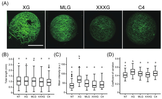 To investigate the effects of xyloglucan on cell wall formation, we evaluated the total length, mean intensity, and CV of Calcofluor-stained fibers in the cell wall network structure of xxt1 xxt2 protoplasts regenerated in the presence or absence of exogenous xyloglucan for 24 h. The addition of xyloglucan resulted in a thick and clear network structure (Figure 2A) and in an increase in the mean intensity and CV values (Figure 2C,D), although no difference was observed in the total length of the network between NT and XG treatment (Figure 2B). We also used another polysaccharide (MLG) and two oligosaccharides (XXXG and C4) as controls because MLG is major hemicellulose of Poales, XXXG is an oligosaccharide obtained by cutting tamarind xyloglucan into tetrasaccharides, and C4 is cellotetraose without a xylose side chain. however, the addition of a polysaccharide or other oligosaccharides did not affect the total length, mean intensity, and CV of intensity distribution (Figure 2). These results suggest that exogenous xyloglucan application altered the fluorescence properties of the Calcofluor-stained cellulose network regenerated from xxt1 xxt2 protoplasts.