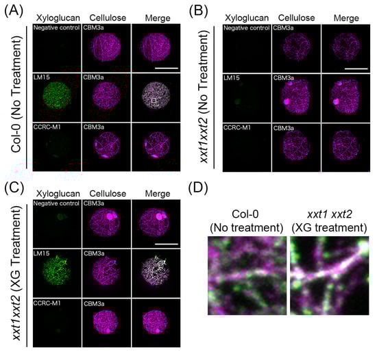 To investigate whether exogenous xyloglucan was incorporated into the regenerated cell wall, we performed immunocytochemistry analysis using xyloglucan- and cellulose fibril-specific monoclonal antibodies: the LM15 antibody, which recognizes XXXG subunits; CCRC-M1 antibody, which recognizes fucosylated side chains of xyloglucans; and CBM3a, which recognizes crystalline cellulose or cellulose fibrils. When WT protoplasts were incubated in the regeneration medium for 24 h, dot-like LM15 signals were observed on the cell surface, and these signals overlapped with cellulose fibrils recognized by CBM3a (Figure 3A,D). On the other hand, little or no signals of CCRC-M1 were detected, indicating that most xyloglucans were not fucosylated in the cell wall regenerated from WT protoplasts. When xxt1 xxt2 protoplasts were incubated in the regeneration medium for 24 h, CBM3a signals were detected, but neither LM15 signals nor CCRC-M1 signals were detected (Figure 3B). However, dot-like LM15 signals overlapping CBM3a signals were observed in xxt1 xxt2 protoplasts incubated for 24 h in the regeneration medium containing xyloglucan (Figure 3C,D). This result shows that exogenous xyloglucan was incorporated into the cell wall network regenerated from xxt1 xxt2 protoplasts.