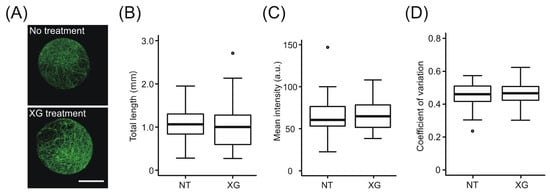 To determine whether the change in the Calcofluor-stained network in the presence of xyloglucan was caused by a state change of cellulose microfibrils or by the deposition of xyloglucan, we characterized the fluorescent signals of the network using immunocytochemistry with CBM3a, which specifically recognizes cellulose fibrils (Figure 4A). Image analysis revealed no differences in the values of total length, mean intensity, and CV of intensity distribution between xxt1 xxt2 protoplasts incubated in the presence of xyloglucan vs. those incubated in the absence of xyloglucan (Figure 4B–D). Although CBM3a is reported to bind to xyloglucan [35], our image analysis did not detect the difference in mean intensity between with or without xyloglucan. This may be due to the lower specificity of CBM3a to xyloglucan compared to cellulose [35]. This result suggests that the increase in mean intensity and CV of Calcofluor-stained network in the presence of xyloglucan was mainly caused by the deposition of xyloglucan.