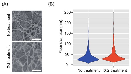 High-resolution imaging analysis of cellulose network, and measurement of fiber diameter in xxt1 xxt2 protoplasts. (A) Field-emission scanning electron microscope (FE-SEM) images of the surface of xxt1 xxt2 protoplasts incubated in regeneration medium lacking xyloglucan (top) or containing xyloglucan (bottom) for 12 h. (B) Violin plot of fiber diameter calculated from the FE-SEM images (n = 500 from 50 images). Significance (vs. No treatment) was determined by Student’s t-test (p < 0.05). Scale bar = 500 nm.