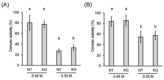 Osmotic stability of xxt1 xxt2 protoplasts. Osmotic stability of xxt1 xxt2 protoplasts incubated in the regeneration medium lacking xyloglucan (NT) or containing xyloglucan (XG) for 24 h (A) or 48 h (B). Protoplasts were incubated in the indicated media for the indicated time points and then transferred to 2-morpholinoethanesulfonic acid (MES) buffer containing either 0.45 M mannitol (same osmotic pressure as the regeneration medium) or 0.35 M mannitol (lower osmotic pressure than the regeneration medium) for 30 min. The ratio of non-ruptured protoplasts after 30 min of incubation was defined as osmotic stability. The experiment was repeated three times using more than 200 cells. Significance was determined by Tukey–Kramer test. Values with “a” and “b” are statistically different at p < 0.05.
