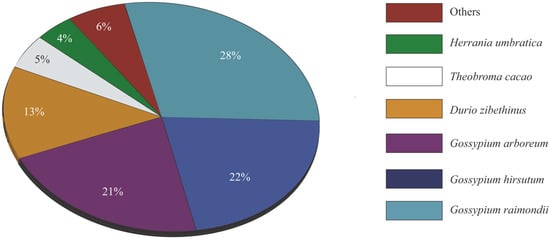 Our transcriptome data included 26,822 high-quality consensus sequences with a total of 59 Mb length (Table 1). This genome-wide coverage of transcripts with complete open reading frames will act as a reference for future studies, including the development of molecular markers for marker-assisted selection for desirable traits in kenaf breeding. The BLAST searches against the protein sequence databases allowed the successful annotation of 42% (11370) transcripts with high e-values. The number of BLAST hits is low compared with other crops analyzed using the same sequencing strategy [,]; nevertheless, the data were sufficient to extract enough useful information to meet the objectives of our study. The low number of BLAST hits can be explained by the limited amount of genomic information available for related species, as well as the different combinations of plant tissues used in previous transcriptome analysis studies. The results of the BLAST searches revealed a close relationship between kenaf and Gossypium species (Gossypium raimondii, Gossypium hirsutum, and Gossypium arboreum), in agreement with previous reported results [,].