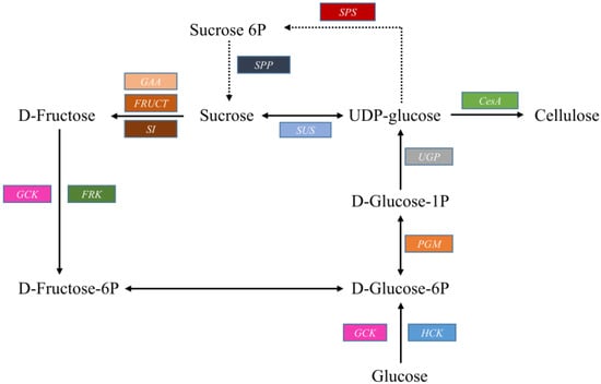 Cellulose synthase (CesA) uses UDP-glucose as a direct precursor for cellulose biosynthesis and is a key enzyme involved in the generation of plant cell wall cellulose. UDP-glucose is synthesized from glucose by the cytosoluble enzymes hexokinase (HK), phosphoglucomutase (PGM), and UDP-glucose pyrophosphorylase (UGP). Sucrose synthase, which can synthesize UDP-glucose, is also considered to be involved in cellulose biosynthesis. We detected candidate genes encoding these major enzymes among the annotated unigenes (Table 2). Besides these genes, we also detected genes that encode enzymes that are indirectly (but can be essential) involved in cellulose syntheses, including sucrose-phosphate synthase (SPS), sucrose-6-phosphatase (SPP), alpha-glucosidase (GAA), beta-fructofuranosidase (FRUCT), sucrase-isomaltase (SI), and fructokinase (FRK). Based on previous studies [,], a hypothetical pathway was constructed (Figure 5). A total of 109 unigenes coding 12 key enzymes that control the pathway route for cellulose synthesis were identified. Among them, 21 unigenes (most represented) were annotated as encoding CesA subunits.