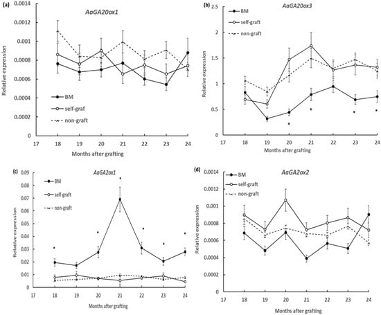 Six GA20-oxidase genes, AaGA20ox1–AaGA20ox6, were previously isolated in breadfruits, with three, AaGA20ox1–AaGA20ox3, predicted to encode functional GA20-oxidase and the other three, AaGA20ox4–AaGA20ox6, predicted to be unprocessed pseudogenes [28]. The expression of the three AaGA20oxs, AaGA20ox1–AaGA20ox3, were measured in scion stems, but only two genes, AaGA20ox1 and AaGA20ox3, showed expression in the current experiment condition. Similarly, of the four GA2ox genes previously identified in breadfruit [29], only two genes, AaGA2ox1 and AaGA2ox2, were detected in scion stem tissues under the current growth condition. All the detectable genes were analysed monthly in the period from 18 to 24 months after grafting. It was shown that the overall expression levels of AaGA20ox3 were over 1000 times higher than those of AaGA20ox1 and that the expression levels of AaGA2ox1 were over 10 times higher than those of AaGA2ox2 for all samples (Figure 2a–c). Over the six month period, scion stems on marang rootstocks showed no significant change in transcript levels of AaGA20ox1 but showed decreased transcript levels of AaGA20ox1 at serval time points, including 20, 21, 23, and 24 months after grafting when compared to those on self-grafts and non-grafts (Figure 2a,b). There was no significance difference between the self-graft and non-graft in the expression of these two genes (Figure 2a,b). For GA2-oxidase genes, higher levels of expression were detected every month from 18 to 24 months except for the 19-month time point for AaGA2ox1, but no significant change for AaGA2ox2 compared to those on self-grafts and non-graft was observed (Figure 2c,d). For both AaGA2ox1 and AaGA2ox2, the expression levels of the self-graft and non-graft were not significantly different (Figure 2c,d).