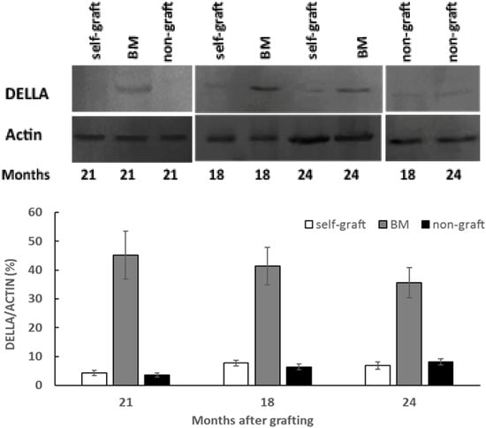 Analyses of DELLA protein abundance in breadfruit scion stems on different rootstocks: Total proteins were extracted from scion stems at 18, 21, and 24 months after grafting. DELLA protein abundance was determined by Western blotting with affinity-purified polyclonal anti-AaDELLA. A representative immunoblot of DELLA protein with actin as a loading control is shown on top of the histogram showing the ratio of the band intensity of the DELLA to that of the corresponding actin. BM, breadfruit plants grafted on marang rootstocks. Vertical bars represent mean ± SE derived from three biological replicates.