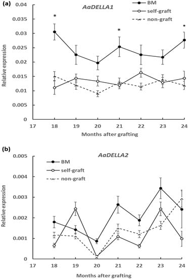 To measure the DELLA protein abundance, a polyclonal anti-AaDELLA was raised which targeted the highly conserved region of AaDELLA1 and AaDELLA2 (see Materials and Methods). DELLA protein abundance was examined in scion stems growing on different rootstocks every 3 months in the period of 18 to 24 months after grafting. Compared to the self-graft and non-graft at the corresponding times, levels of immunologically detectable DELLA were obviously higher in scion stems grafted on marang rootstocks, indicating an increase in the accumulation of DELLA proteins at all the tested time points (Figure 3). The transcript levels of AaDELLA1 and AaDELLA2 were further analysed in scion stems growing on different rootstocks. When compared to those on the self-graft and non-graft over the 6-month period, scion stems on marang rootstocks were found to have increases in the expression of AaDELLA1 at three time points, including 18, 21, and 24 months, but to have relatively stable expression of AaDELLA2 (Figure 4). The expression levels between the self-graft and the non-graft were not significantly different for both genes (Figure 4).
