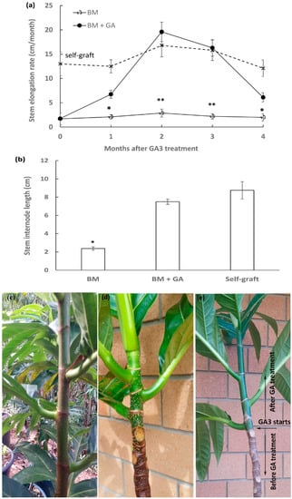Rescue of scion stem elongation by exogenous GA3 application in breadfruit plants on marang rootstocks: Comparison of stem elongation rate (a) and internode length (b) in GA3-treated and non-treated plants. Representatives of grafted plants displaying different scion stem internodes: (c) Untreated breadfruit scions on breadfruit rootstock (self-graft), (d) untreated breadfruit scions on marang rootstock, and (e) GA3-treated breadfruit scions on marang rootstock. The stem internode length was the averaged measurement of the second internodes at the third month after GA3 treatment. BM, breadfruit plants growing on marang rootstocks. All values represent mean ± SE from three biological replicates, with ** significant difference (p < 0.05) from the rest of the samples (non-graft and self-graft) and * significant difference from the non-graft only.
