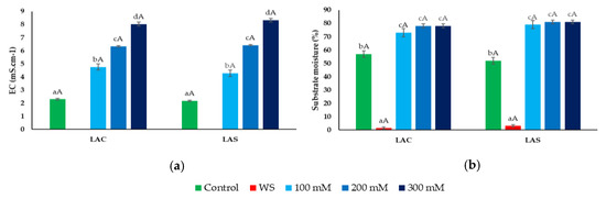 Figure 1. Substrate electrical conductivity (EC) (a), and moisture (%) (b), after 30 days of control, water deficit (WS) or salt stress (100, 200, 300 mM NaCl) treatments. Values shown are means ± SE (n = 5). Different lowercase letters above the bars indicate significant differences between treatments for each variety (LAC: Lavandula angustifolia var. Codreanca; LAS: L. angustifolia var. Sevtopolis), and different uppercase letters indicate significant differences between the two varieties for pots that underwent the same treatment, according to the Tukey test (α = 0.05).