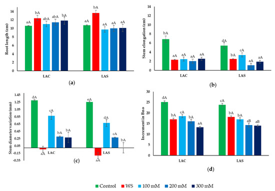 Figure 2. Effect of water and salt stress treatments on growth parameters in L. angustifolia var. ‘Codreanca’ (LAC) and var. ‘Sevtopolis’ (LAS). Root length (RL) (a); stem elongation (SE) (b); increase in stem diameter (SD) (c); increment in the number of branches (Bno) (d) in lavender plants after 30 days of growth under control conditions, in the presence of the indicated NaCl concentrations or subjected to water stress (WS) (completely withholding irrigation). Stem length, stem diameter, and number of branches were measured in all plants just before starting the treatments (time 0), and before collecting the samples (time 30). Bars represent means ± SE (n = 5). Different lowercase letters above the bars indicate significant differences between treatments for each variety, and different uppercase letters indicate significant differences between the two varieties for plants undergoing the same treatment, according to the Tukey test (α = 0.05).