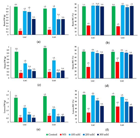 Figure 3. Effect of water and salt stress treatments on growth parameters in L. angustifolia var. ‘Codreanca’ (LAC) and var. ‘Sevtopolis’ (LAS). Fresh weight (FW) (a,c,e) and water content percentage (WC%) (b,d,f) of roots (a,b), stems (c,d) and leaves (e,f) of lavender plants after 30 days of growth under control conditions, in the presence of the indicated NaCl concentrations or subjected to water stress (WS) (completely withholding irrigation). Bars represent means ± SE (n = 5). Different lowercase letters above the bars indicate significant differences between treatments for each variety, and different uppercase letters indicate significant differences between the two varieties for plants undergoing the same treatment, according to the Tukey test (α = 0.05).