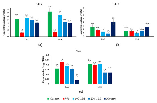 Figure 4. Photosynthetic pigment concentrations under water deficit and salt stress conditions. Leaf contents of chlorophyll a (Chl a) (a), chlorophyll b (Chl b) (b), and total carotenoids (Caro) (c) in L. angustifolia var. ‘Codreanca’ (LAC) and var. ‘Sevtopolis’ (LAS) plants after 30 days of growth under control conditions, in the presence of the indicated NaCl concentrations or subjected to water stress (WS) (completely withholding irrigation). DW, dry weight. Bars represent means ± SE (n = 5). Different lowercase letters above the bars indicate significant differences between treatments for each variety, and different uppercase letters indicate significant differences between the two varieties for plants undergoing the same treatment, according to the Tukey test (α = 0.05).