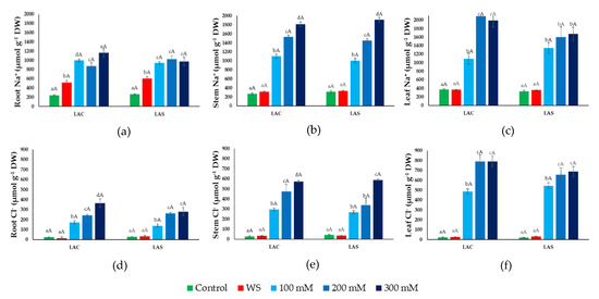 Figure 5. Ion contents under water deficit and salt stress conditions. Sodium (Na+) (a,b,c) and chloride (Cl) (d,e,f) concentrations in roots (a,d), stems (b,e), and leaves (c,f) of L. angustifolia var. ‘Codreanca’ (LAC) and var. ‘Sevtopolis’ (LAC) plants after 30 days of growth under control conditions, in the presence of the indicated NaCl concentrations or subjected to water stress (WS) (completely withholding irrigation). DW, dry weight. Bars represent means ± SE (n = 5). Different lowercase letters above the bars indicate significant differences between treatments for each variety, and different uppercase letters indicate significant differences between the two varieties for plants undergoing the same treatment, according to the Tukey test (α = 0.05).