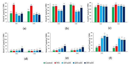 Figure 6. Ion contents under water deficit and salt stress conditions. Potassium (K+) (a,b,c) and calcium (Ca2+) (d,e,f) concentrations in roots (a,d), stems (b,e), and leaves (c,f) of L. angustifolia var. ‘Codreanca’ (LAC) and var. ‘Sevtopolis’ (LAS) plants after 30 days of growth under control conditions, in the presence of the indicated NaCl concentrations or subjected to water stress (WS) (completely withholding irrigation). DW, dry weight. Bars represent means ± SE (n = 5). Different lowercase letters above the bars indicate significant differences between treatments for each variety, and different uppercase letters indicate significant differences between the two varieties for plants undergoing the same treatment, according to the Tukey test (α = 0.05).