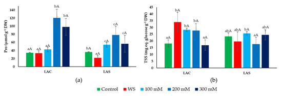 Figure 7. Leaf contents of proline (Pro) (a) and total soluble sugars (TSSs) (b) in L. angustifolia var. ‘Codreanca’ (LAC) and var. ‘Sevtopolis’ (LAS) plants after 30 days of growth under control conditions, in the presence of the indicated NaCl concentrations or subjected to water stress (WS) (completely withholding irrigation). DW, dry weight. Bars represent means ± SE (n = 5). Different lowercase letters above the bars indicate significant differences between treatments for each variety, and different uppercase letters indicate significant differences between the two varieties for plants undergoing the same treatment, according to the Tukey test (α = 0.05).