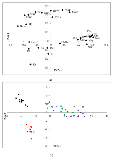 Figure 8. Loading plots of the Principal Component Analysis (PCA) (a), conducted with the analyzed traits in L. angustifolia (var. ‘Codreanca’ and var. ‘Sevtopolis’), subjected to salt and water stress conditions for 30 days, based on the first and second components accounting for 36.5% and 23.9%, respectively, of the total variability observed. RL, root length; SE, stem elongation; SD, stem diameter increment; Bno, increment in the number of branches; RFW, root fresh weight; RWC, root water content; SFW, stem fresh weight; SWC, stem water content; LFW, leaf fresh weight; LWC, leaf water content; Chl a, chlorophyll a; Chl b, Chlorophyll b; Caro, total carotenoids; Nar, sodium in roots; Clr, chloride in roots; Kr, potassium in roots; Car, calcium in roots; Nas, sodium in stems; Cls, chloride in stems; Ks, potassium in stems; Cas, calcium in stems; Nal, sodium in leaves; Cll, chloride in leaves; Kl, potassium in leaves; Cal, calcium in leaves; Pro, proline; TSSs, total soluble sugars. Scatter plot of the PCA scores (b): Control (black symbols), water stress (red), 100 mM NaCl (blue), 200 mM NaCl (green), and 300 mM NaCl (violet); LAC variety (circles); LAS (squares).