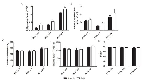 We previously reported that higher amounts of H2O2 accumulated in plastids of adult phase leaves than that of juvenile phase []. To exclude the possible effect of differences in physical position and/or light exposure acquisition on leaf H2O2 content or photosynthesis, the H2O2 content and photosynthetic properties were re-examined using vegetative propagated trees. Significantly higher H2O2 content was detected in scion leaves from the adult phase than that from the juvenile phase. This confirmed the age-related H2O2 accumulation in adult phase (Figure 1A). The mean net photosynthetic rate (NPR) was slightly higher in scion leaves from the adult phase than that from the juvenile phase, but the differences were not statistically significant (Figure 1B). Due to the genetic hyper-heterozygosity and extensive offspring segregation, the H2O2 and NPR varied among three hybrids also. No substantial changes in minimal/maximal fluorescence and Fv/Fm values were detected (Figure 1C–E). These data indicated that there was no variation in the net photosynthetic rate or photosynthetic electron transport between ontogenetic phases.