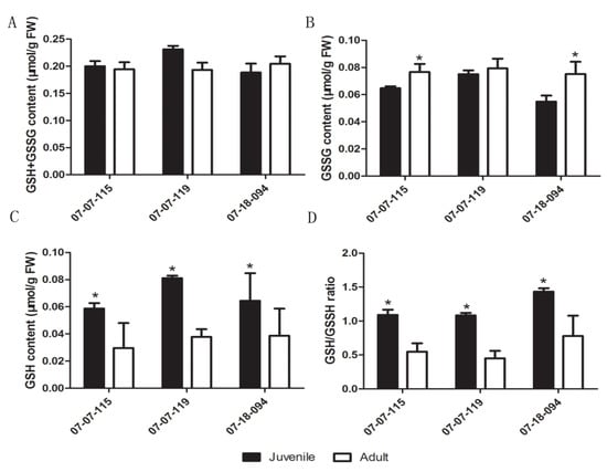 Using grafted trees, we re-investigated the concentration of GSH, GSSG, GSH+GSSG, and the GSH/GSSG ratio in the juvenile and the adult phase leaves. The GSSG+GSH concentration did not vary significantly, except that was relatively higher in juvenile sample from the 07-07-119 (p = 0.07) (Figure 2A). Significantly higher GSSG contents were detected in the adult phase than that in the juvenile phase of 07-07-115 and 07-18-094 hybrids (Figure 2B). Conversely, the GSH content and the GSH/GSSG ratio were significantly lower in samples from the adult phase than that from the juvenile phase (Figure 2C,D).