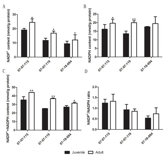 The ratio of NADP+/NADPH provides an indication of subcellular reducing power [,]. We calculated the NADP+/NADPH ratios to confirm or exclude the involvement of the NTRC/2-Cys Prx system during the vegetative phase change. The contents of NADP+, NADPH and NADP++NADPH were significantly higher in samples from the adult phase than that from the juvenile phase, except in hybrid 07-18-094, where the differences in NADPH were not statistically significant (Figure 3A–C). The NADP+/NADPH ratio did not differ significantly between the adult and the juvenile samples (Figure 3D). These data indicated that the NTRC/2-Cys Prx system might not participate in plastid redox regulation.