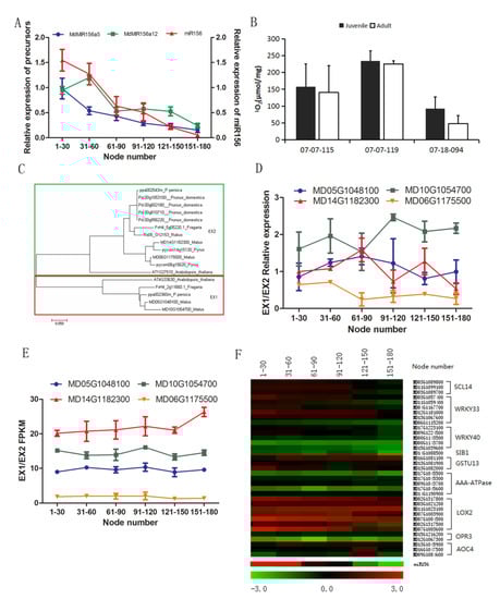 The declines in expression of MdMIR156a5, MdMIR156a12, and miR156 along with node numbers were apparently shown in Figure 4A. It has been reported that the excess 1O2 release in PSII triggers an immediate induction of nuclear gene expression that depends on β-CC or on the plastid EX1 and EX2 proteins [,]. However, no significant difference in 1O2 levels were observed between leaves of the juvenile and the adult phase (Figure 4B). There are four genes in apple genome homologous to Arabidopsis thaliana and other Rosaceae plants encoding EX1/EX2 (Figure 4C). However, expression of none of these genes exhibited significant changes with node numbers (Figure 4D,E).