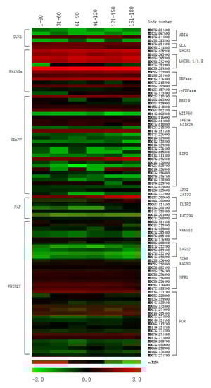 Heat map showing photosynthetic redox state-generated plastid to nucleus retrograde signal targeted gene expression profiles during ontogenesis in leaves of apple hybrids derived from Malus asiatica ‘Zisai Pearl’× M. domestica ‘Red Fuji’. The gene expression was shown in fragments per kilobase of transcript per million fragments mapped (FPKM) of nuclear genes downstream from GUN1, PhANGs, MEcPP, PAP and the WHIRLY signaling pathways. The dynamic changes in miR156 expression, along with node numbers, were presented alone at the bottom of the heat map to make convenience for comparison.