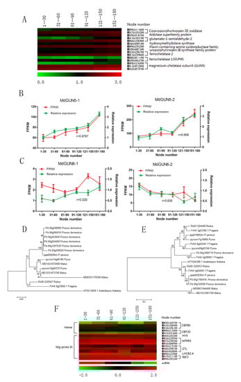 Mg-Proto IX and heme biosynthetic genes and their target nuclear genes during ontogenesis of apple hybrid 07-07-115 derived from Malus asiatica ‘Zisai Pearl’× M. domestica ‘Red Fuji’. (A) Heat map showing expression of Mg-Proto IX and heme biosynthetic genes based on RNA sequencing (RNA-seq) data. (B,C) Validation of MdGUN5 (B) and MdGUN6 (C) gene expression using RNA-seq in fragments per kilobase of transcript per million fragments mapped (FPKM) and relative expression by quantitative real time q(RT)-PCR. Error bars represent one standard deviation of the three biological replicates. The r-value represents the Pearson correlation coefficient between FPKM and the relative expression. (D,E) Phylogeny of MdGUN5 and MdGUN6 gene family members, respectively. The phylogenetic relationship was inferred by neighbor joining analysis based on amino acid differences (p-distance) using the MEGA 7.0 program with complete deletion and 1000 bootstrap replicates. The short line at the bottom of the panel represents the scale bar. (F) Expression profiles of Mg-Proto IX and heme target nuclear genes based on RNA-seq analysis.