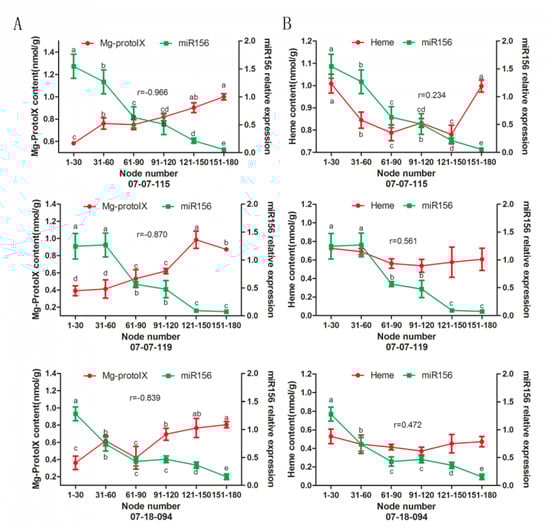 Changes in leaf Mg-Proto IX (A) and heme (B) contents and the correlation with miR156 levels, along with node numbers of hybrids derived from Malus asiatica ‘Zisai Pearl’× M. domestica ‘Red Fuji’. The r-value represents the Pearson correlation coefficient between miR156 relative expression and Mg-Proto IX or heme contents. Error bars represent one standard deviation of the three biological replicates. The lower-case letters above each column indicate the statistical significance (p < 0.05) by analysis of variance followed by Duncan’s multiple-range test.