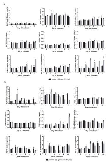 To validate the correlation between tetrapyrroles levels, miR156 expression, or GSH content, ALA and gabaculine were applied to the culture media of in vitro apple shoots. ALA is a precursor of tetrapyrroles and is readily taken up by plants. Supplying ALA induces rapid increase in tetrapyrrole biosynthesis []. Gabaculine inhibits the activity of the second ALA synthesis enzyme, glutamate semialdehyde aminomutase, leading to decrease in tetrapyrroles [].