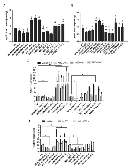 Changes in Mg-proto IX (A) and heme (B) concentrations and their synthesis (C) and target (D) gene expression in transformed GL-3 in vitro shoots constitutively over-expressing MIM156, MdMIR156a6, MdGGT1 or MdGGT1-RNAi compared with the untransformed wild type (WT). Error bars represent the standard deviations of three biological replicates. Different lowercase letters and asterisks indicate statistical significance at p < 0.05, two asterisks indicate statistical significance p < 0.01.