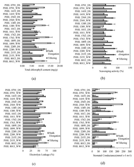 The significant interaction among the three factors evaluated showed that the Chl of each genotype varies in each growing condition and growth stage, and some varieties are quite stable in terms of their Chl values (Table A1). This was evident in the case of PHIL 2005-1763, which had the lowest value among the 10 genotypes in the well-watered and drought stress treatments at the tillering stage and the highest Chl values during drought imposed at the stalk elongation stage. However, other genotypes, such as PHIL 2006-2289, had a relatively stable performance in terms of Chl relative to the other genotypes evaluated (Figure 1a).
