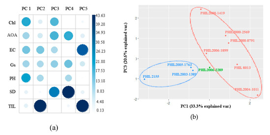 Biplots based on PC1 and PC3 are shown in Figure 2b. During drought stress at the tillering stage, PHIL 8013, PHIL 2000-2569, PHIL 2000-0791, PHIL 2004-1011, PHIL 2000-1419, and PHIL 2006-1899 were classified by high AOA (82.57%), high EC (59.22%), and high internode length (8.02 mm). PHIL 2155, PHIL 2003-1389, and PHIL 2005-1793 were classified by low Chl (4.57 mg/g), high AOA (82.57%), and high EC (59.22%).
