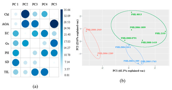 (a) Principal component analysis (PCA) showing the different loadings or contributions of each variable per principal component; and (b) PCA-based biplot showing the clustering of the 10 sugarcane genotypes subjected to drought at tillering stage using principal component (PC)1 and PC3.