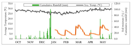 Monthly average temperature, cumulative rainfall, and soil moisture (red line) of the experimental field from October 2018 to April 2019. Drought stress treatment started in March 2019.