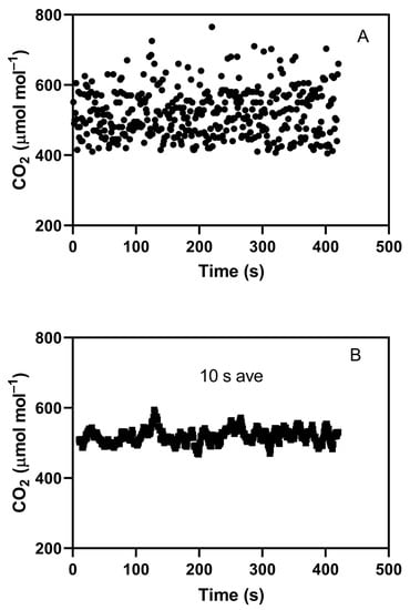 An example of an indoor chamber with on–off CO2 control showing a large degree of short-term CO2 variation is shown in Figure 1A. In this case, an M-18 chamber, interior dimensions 90 × 180 cm, with an interior height of 190 cm (EGC Inc., Chagrin Falls, OH, USA) was controlled with a TC3 controller (EGC Inc., Chagrin Falls, OH, USA). CO2 for control was sampled with an external WMA-4 CO2 analyzer (PP Systems, Amesbury, MA, USA) just outside the chamber, with analyzer output sent to the TC3 controller, which utilized proportional-integral-derivative PID control of an on–off solenoid valve. Air for CO2 control purposes was sampled from a shaded, ventilated box about 30 cm above the top of a full soybean canopy with a leaf area index of about 4. Pure CO2 was added to the chamber at the outlet of the air circulation fans mounted in the chamber side walls. Chamber air flow was downward in the plant compartment and upward through the side walls, which contained the temperature-control heat exchangers. For short-term CO2 analysis, air was sampled for 0.1 s at 1 s intervals using a LiCor open-path CO2 analyzer (LI-7500, Li-Cor, Inc., Lincoln, NE, USA) mounted horizontally 10 cm above the center of the plant canopy. The target CO2 concentration was 515 μmol mol−1. The standard deviation of CO2 detected by the WMA-4 analyzer was 15 μmol mol−1, while that detected by the Li-Cor analyzer was 68 μmol mol−1, with mean values of 515 and 520 μmol mol−1, respectively. The same 0.1 s data, but with a 10 s running average applied, is shown in Figure 1B. This running average also produced a standard deviation of about 15 μmol mol−1. A standard deviation of 15 μmol mol−1 is in the low range of those reported for elevated CO2 treatments in indoor chambers. This example indicates that actual short-term variation in CO2 in indoor chambers may routinely be much larger than detected by the analyzer controlling CO2 injection and documenting the CO2 control, because of averaging during sampling by the controlling analyzer. The primary purpose of this paper is to test whether even the normal and modest cyclic variation in CO2 concentration that occurs in most indoor chambers has an impact on plant growth through its effect on stomatal conductance and photosynthesis.