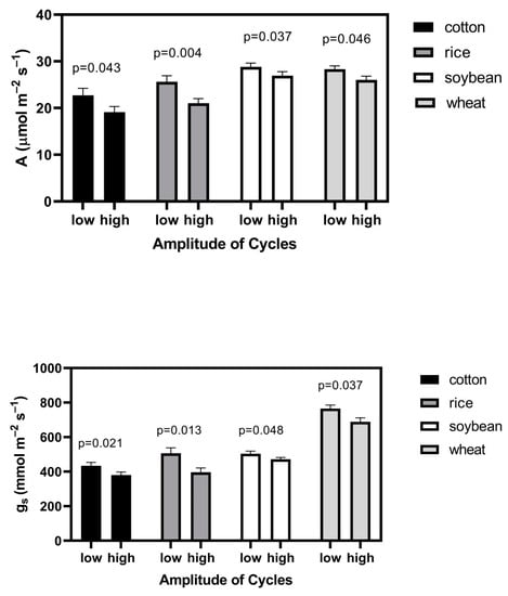 Leaf photosynthesis, A, and stomatal conductance, gs measured at constant CO2 of 560 μmol mol−1, 26 °C, 1000 μmol m−2 s−1 photosynthetic photon flux density, and a water vapor pressure deficit of 1.5 kPa for four species grown with lower and higher amplitudes cycles of CO2 (see text for details). “p” indicates the probability of a greater F value, using ANOVA, with four chamber means per species per treatment, with each chamber value representing a mean value for six individual plants per species. Bars indicate SD.