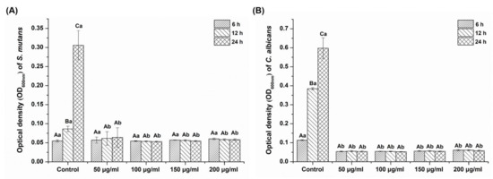 Optical density (OD600nm) of each experimental group (50 μg/mL, 100 μg/mL, 150 μg/mL and 200 μg/mL) with (A) Streptococcus mutans and (B) Candida albicans at three different times, compared with a control group. The same lowercase letter (a–b) indicates no significant differences in optical density between the group at each time point (p > 0.05). The same uppercase letter (A–C) indicates no significant differences in optical density value among three different times for each group (p > 0.05).