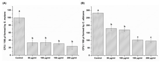 Colony-forming units (CFU) number for each experimental group (50 μg/mL, 100 μg/mL, 150 μg/mL and 200 μg/mL) with (A) Streptococcus mutans and (B) Candida albicans, compared with a control group. The same lowercase letter (a–c) indicates no significant difference in CFU values between the groups of a given microbial (p > 0.05).
