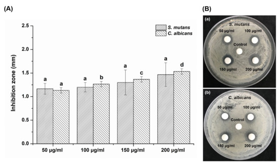 (A) Inhibition zone size for each experimental group (50 μg/mL, 100 μg/mL, 150 μg/mL and 200 μg/mL) on Streptococcus mutans and Candida albicans agar plates. The same lowercase letter (a–d) indicates that there was no significant difference in inhibition zone sizes for the experimental groups of the two microbial (p > 0.05). (B) Images of the inhibition zones for various concentrations of Reynoutria elliptica extract with (a) Streptococcus mutans and (b) Candida albicans agar plates.