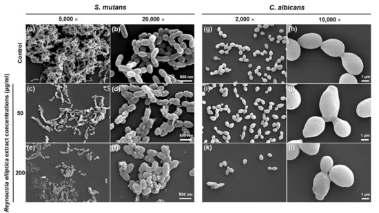 To examine further the effect of the Reynoutria elliptica extract on microbial morphology, 0.5 mL of each experimental solution was added into microbial suspensions (1 × 105 cells/mL) at 1:1 ratios. Subsequently, the 1 mL of the microbial suspension and experimental solution was added to a 24-well plate (Thermo Fisher Scientific Inc., Waltham, MA, USA) and incubated at 37 °C for 24 h. For microscopic examination, the S. mutans and C. albicans were fixed with 2% glutaraldehyde/paraformaldehyde in 0.1 M PBS for 30 min at room temperature (25 ± 1 °C). The fixed S. mutans and C. albicans were then post-fixed with 1% OsO4 dissolved in 0.1 M PBS for 2 h, dehydrated with an ascending gradual series of ethanol, treated with isoamyl acetate, and then subjected to critical point drying (LEICA EM CPD300; Leica, Wien, Austria). The S. mutans and C. albicans was then sputter-coated with Pt and observed using a scanning electron microscopy (FE-SEM; Merin, Carl Zeiss, Oberkochen, Germany) with an accelerating voltage of 2.0 kV.