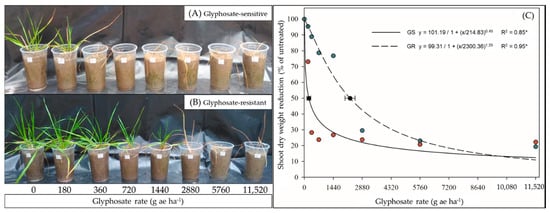 Glyphosate dose–response curves of (A,C) glyphosate-sensitive (GS) and (B,C) glyphosate-resistant (GR) biotypes of Lolium multiflorum at 28 days after treatment (DAT). (C) Lines are the response curves predicted using non-linear regression. Red and green symbols represent mean dry weight (% reduction of untreated) of GS and GR, respectively. The black symbols represent the GR50 for each respective biotype and the bars are the confidence intervals (CI: p ≤ 0.05).