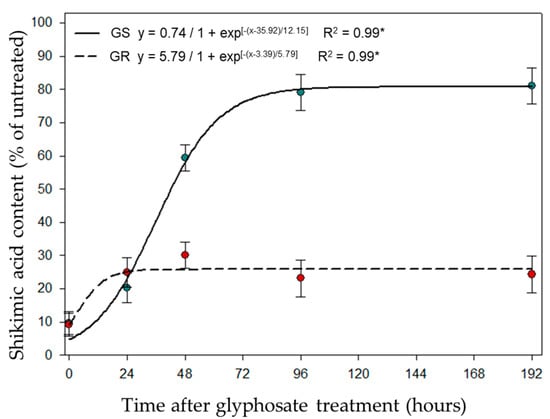 The results of shikimic acid content (SAC) showed a significant difference between GR and GS. In the GR biotype, there was a slight increase of SAC during the first 24 h, and the levels remained stable after that. In the GS biotype, an accentuated increase of SAC levels occurred from 0 to about 72 h after glyphosate treatment, reaching the highest level at approximately 80 h and stabilizing after that time at high levels (Figure 2).