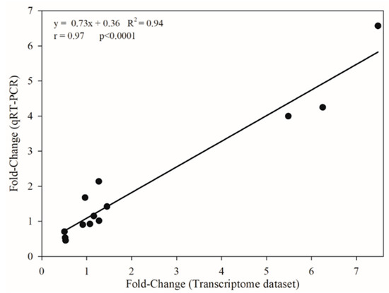 The results of the relative gene expression for 13 genes assessed on qRT-PCR were correlated to those from RNA-seq differential expression analysis. The overall results of gene expression in response to glyphosate treatment presented an amplitude from 0.03 to 275.7 in relative expression in qRT-PCR, whereas for RNA-seq data the amplitude ranged from 0.008 to 78.9 (Figure 3; Table S1). The comparisons between the results obtained from qRT-PCR and RNA-seq indicated a significative correlation of r = 0.97 (p < 0.0001), suggesting the reliability of the RNA-seq dataset (Figure 3; Table S1).